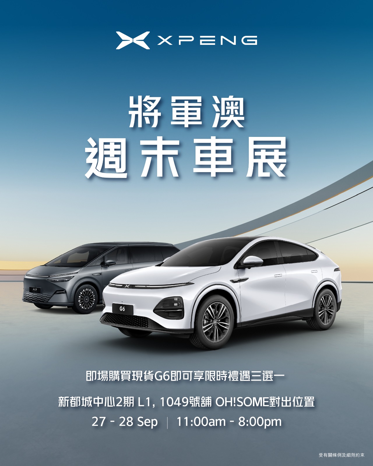 各位西貢及將軍澳地區居民,XPENG誠意邀請各位蒞臨於2025年9月27日至28日新都城中心2期舉行的車展,親身體驗及選購最新車款。